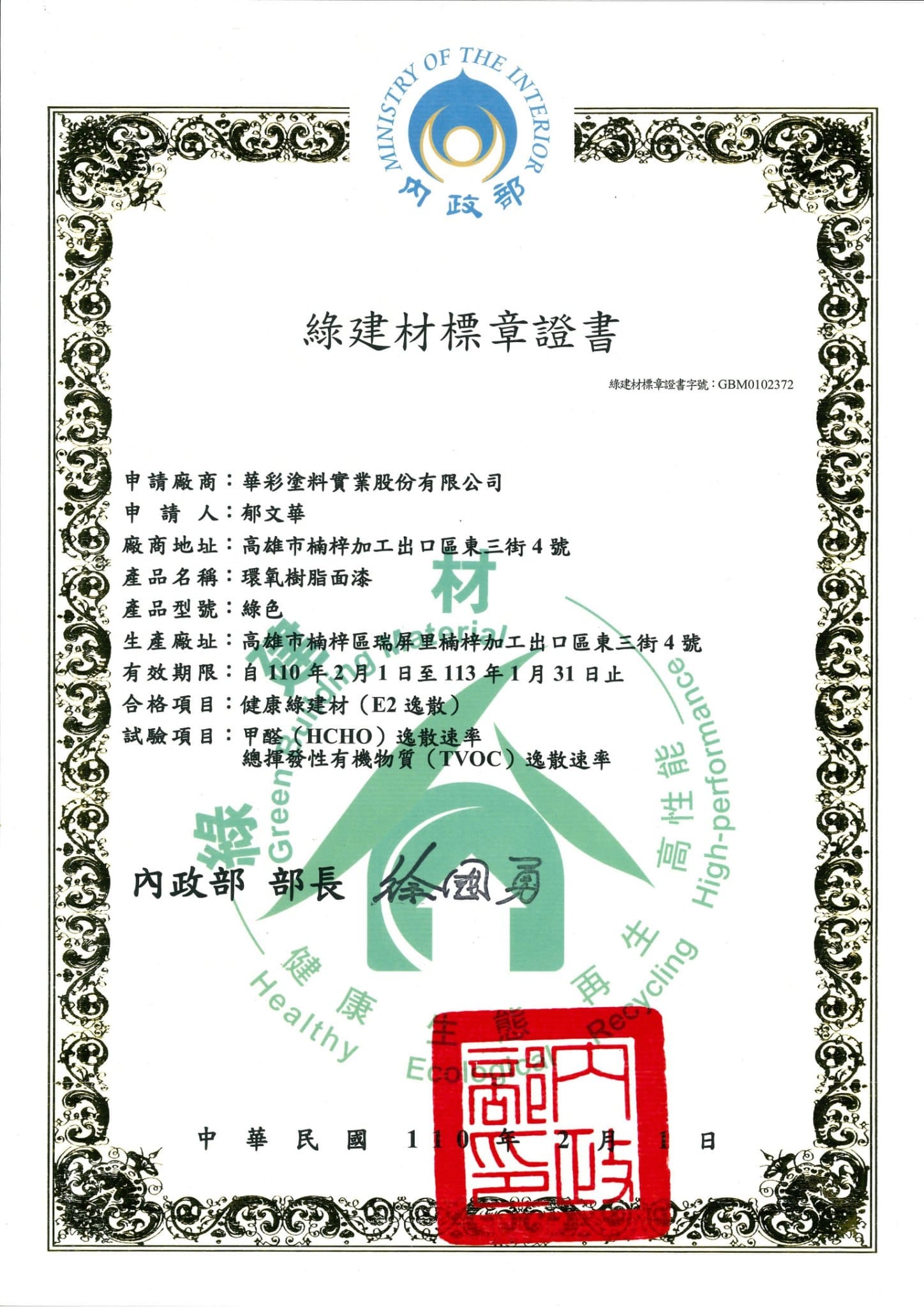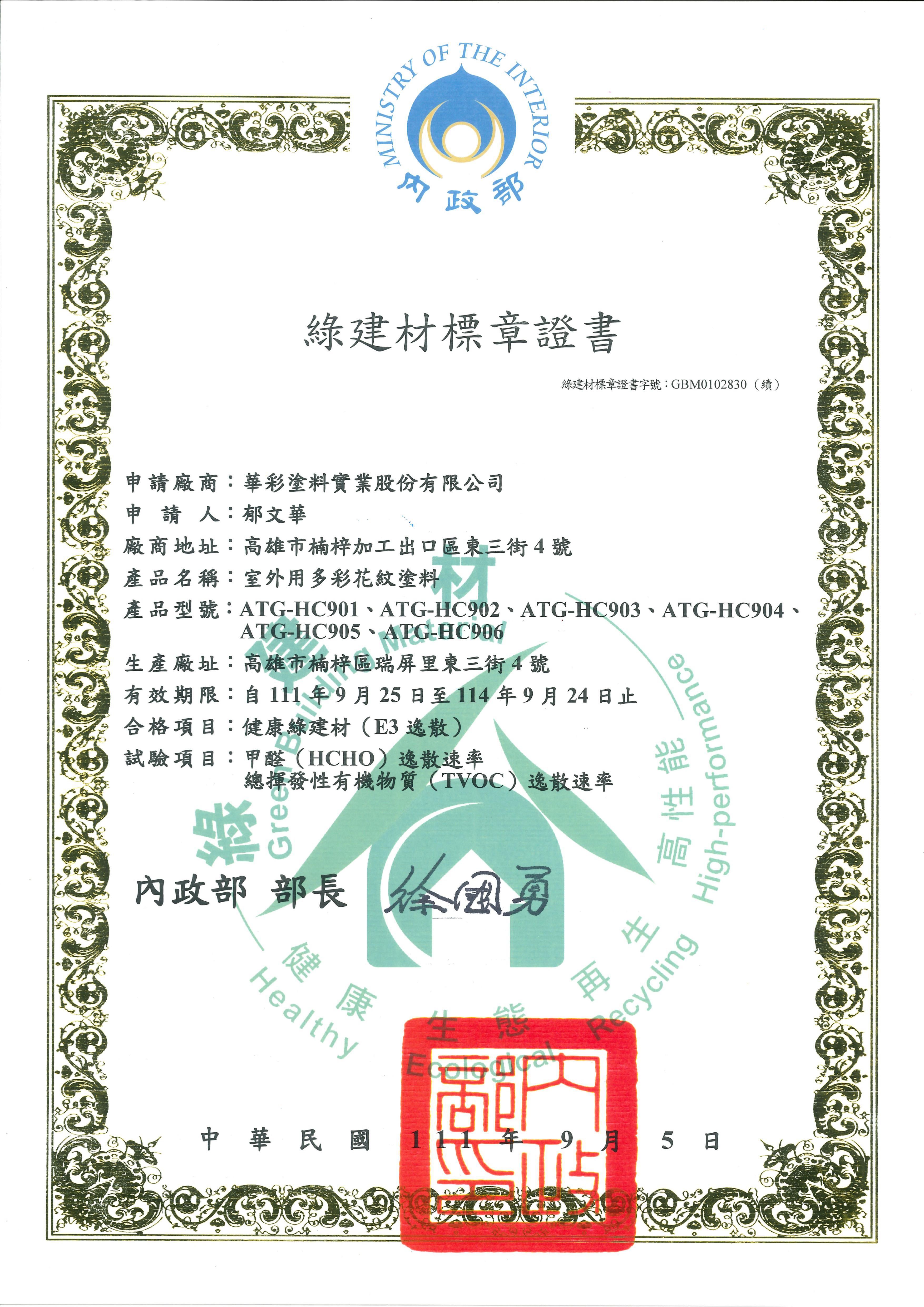 綠建材標章證書