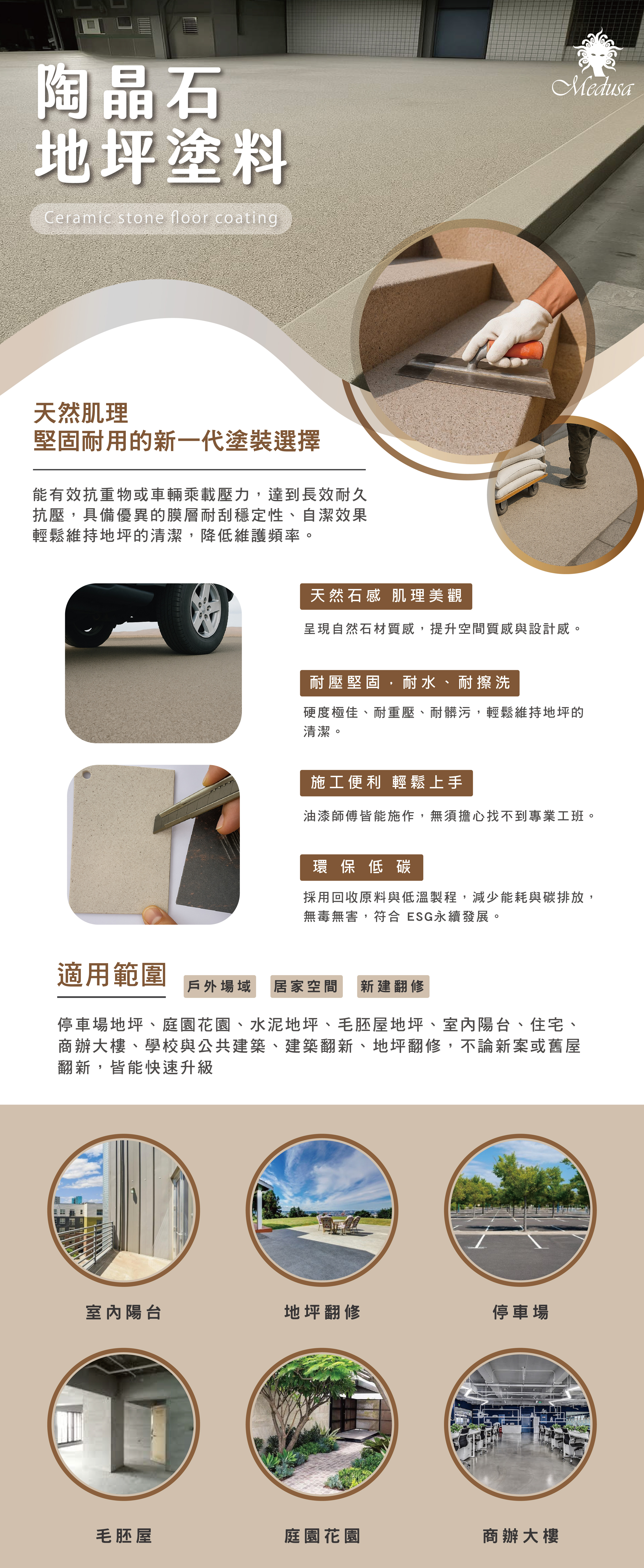 Home: Concrete floors, bare-bones floors, indoor balconies, residences, commercial buildings, schools, and public buildings