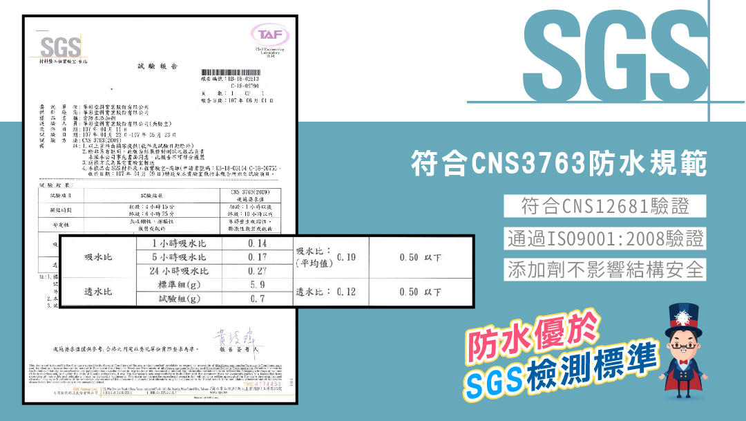 Hua Tsai Paint develops products based on its own experience, and takes green energy and environmental protection as the core to develop natural, non-toxic and safe plant inorganic liquid waterproof materials. Use the exclusively developed crystal growth technology to achieve the waterproof effect of building materials, strengthen the structure and improve the hydrophobic performance of the existing cement paint! Certified by SGS, the waterproof water absorption ratio is 0.19, conforms to the CNS3763 waterproof specification, passed the CNS12611 pull-out test, and ISO9001: 2008 and CNS12681 and other verifications.